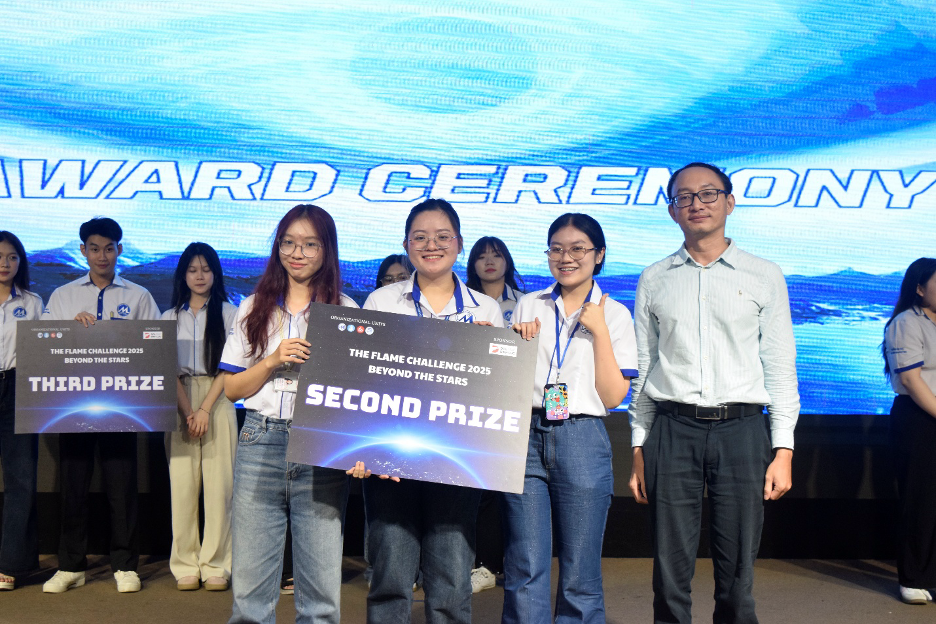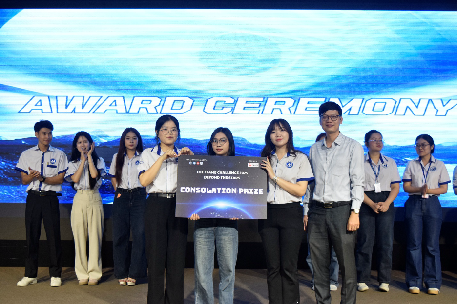 After emotional performances, the judging panel selected the top‑performing team to be crowned Champion of The Flame Challenge III – 2025. The announcement moment came amid cheers and anticipation across the hall. Alongside the Champion title, the organizers also presented Second Prize, Third Prize, and Consolation Prize to acknowledge teams’ efforts and creativity. IFBT leaders and the DOL IELTS Dinh Luc representative personally delivered the awards, honoring achievements and spreading academic spirit among UFM students.