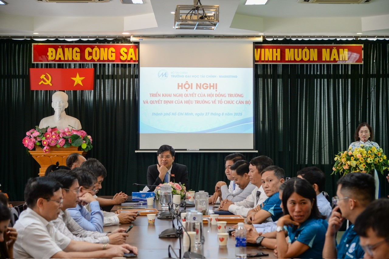 On 27/08/2025, with the attendance of Dr. Cao Tan Huy, Party Committee Secretary; Assoc. Prof. Dr. Pham Tien Dat, Rector; members of the Board of Rectors; leaders of offices/departments/institutes; and all lecturers and staff of the Faculty of Finance & Banking, the University held a Conference to announce Resolution No. 198/NQ‑DHTCM‑HDT of the University Council on renaming the Faculty of Finance & Banking to the Institute of Finance & Banking Technology, together with the Rector’s personnel decisions. This marks an important milestone, reflecting a new step forward in the University’s strategy for training, research, and international integration.