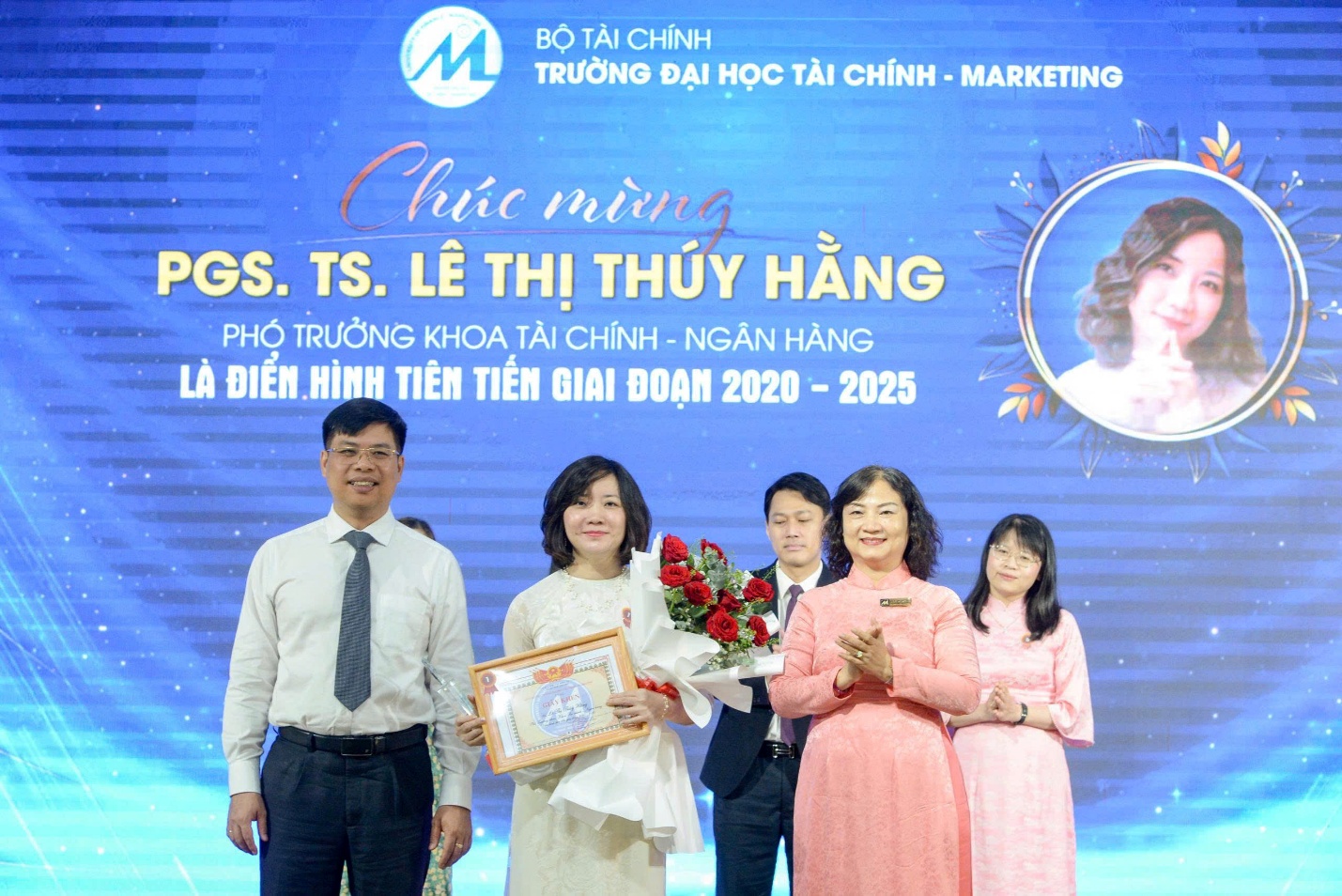 Photo 3: UFM leaders present flowers congratulating Assoc. Prof. Dr. Le Thi Thuy Hang on receiving the Exemplary Individual title for 2020–2025.