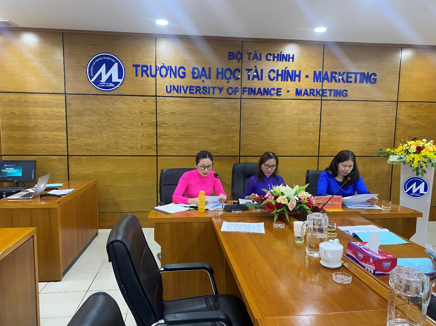 Presidium of the Conference: From left to right: MSc. To Thi Hong Gam, President of the Faculty Trade Union; Assoc. Prof. Dr. Nguyen Thi My Linh, Vice Dean in Charge of the Faculty of Finance and Banking; Dr. Tran Thi Dien, Vice Dean of the Faculty of Finance and Banking