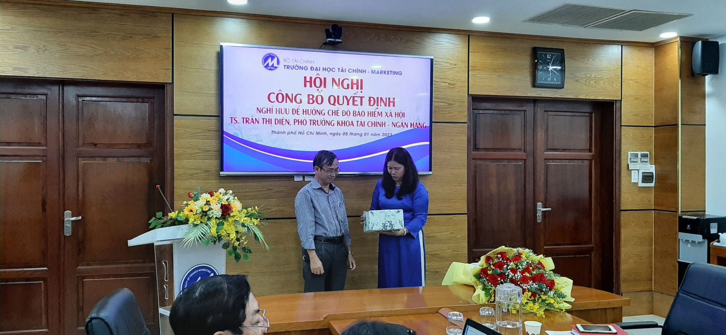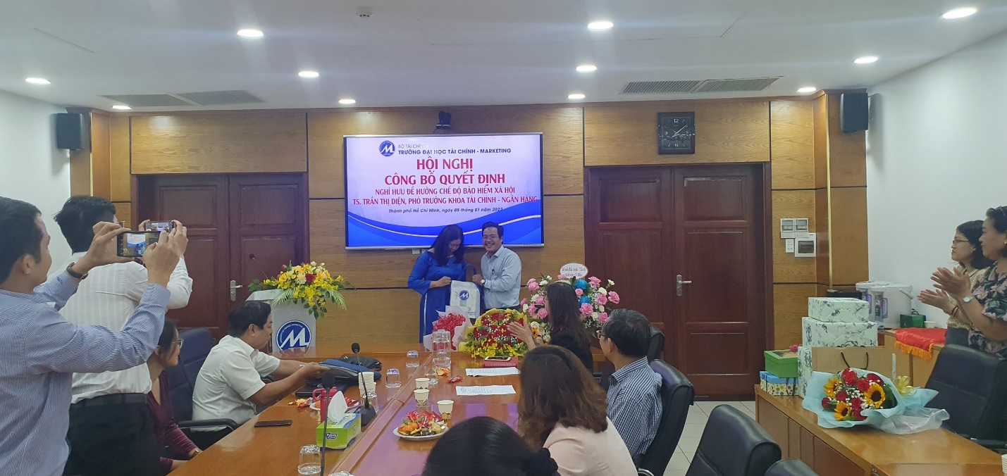 On the afternoon of January 5, 2023, in a warm, solemn, and intimate atmosphere, the University of Finance and Marketing (UFM) held a conference to announce the retirement decision to enjoy social insurance benefits for Dr. Tran Thi Dien, deputy dean of the Faculty of Finance and Banking after many years of working at the University.