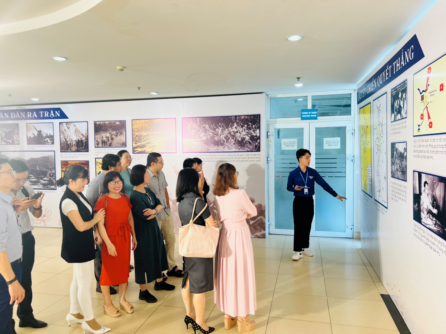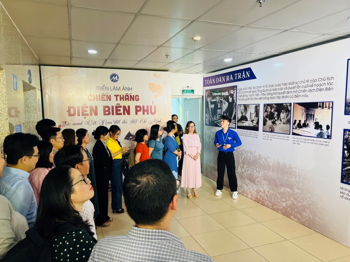 Party cell members and lecturers of the Faculty of Finance – Banking listen to a guided introduction to images of the Dien Bien Phu Campaign