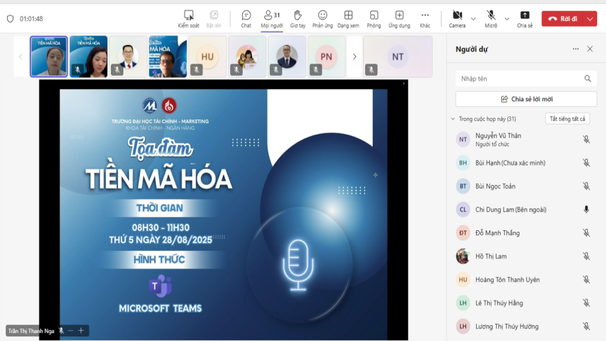 On 28/08/2025, the Institute of Finance & Banking Technology, University of Finance & Marketing, organized an online scientific seminar on “Cryptocurrency and Future Trends.” The program was hosted on MS Teams with the participation of the Institute’s leadership, lecturers, and interested guests.