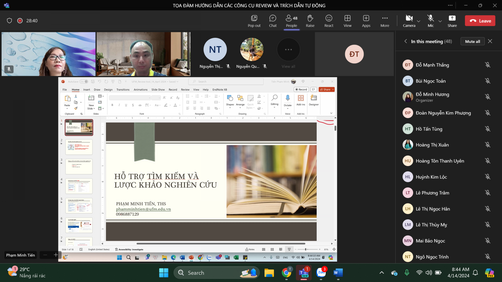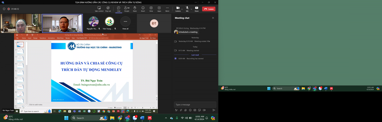 With the aim of supporting postgraduate students in accessing useful tools for scientific research, the Faculty of Finance – Banking (FFB) of the University of Finance – Marketing held a seminar titled “Guidance on Literature‑Review Tools and Automatic Citation” at 8:30 a.m. on 14/04/2024. The seminar was chaired by Assoc. Prof. Dr. Nguyen Thi My Linh, Dean of the Faculty of Finance – Banking, with two speakers: Dr. Bui Ngoc Toan, lecturer of the Faculty, and MSc. Pham Minh Tien, editor of the Journal of Finance – Marketing Research.