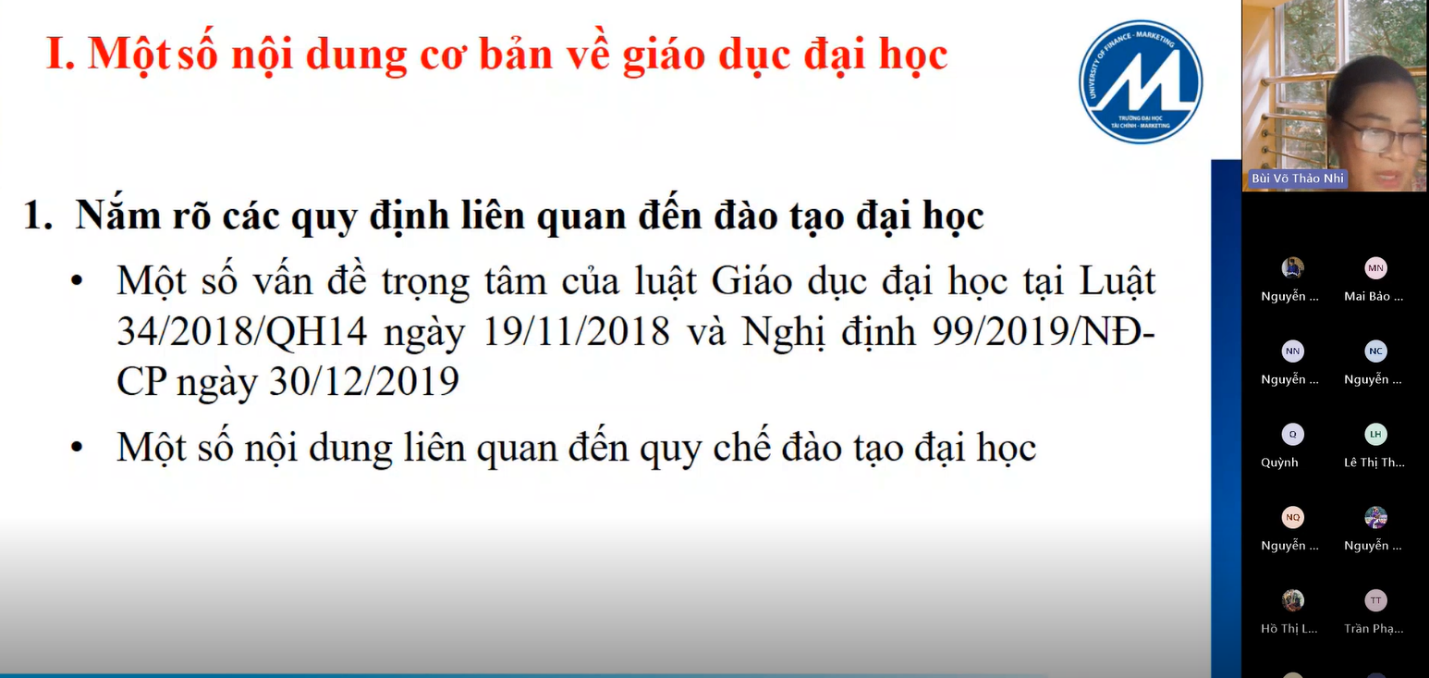 Based on Plan No. 1057/KH-UFM dated 17 April 2024 of the University of Finance and Marketing on organizing a training course for staff assigned to academic advising duties; Decision No. 1159/QD-UFM dated 25 April 2024 of the Rector of the University of Finance and Marketing on nominating staff to attend the training course for academic advisors; and Notice No. 1304/TB-UFM dated 15 May 2024 on holding a seminar on experiences in academic advising and career orientation.
