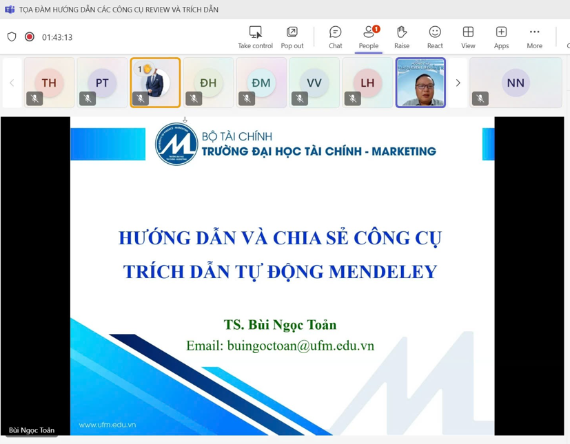 To support master’s students in enhancing research skills—especially literature search, reference management, accurate citation, and consistency in coursework, thesis writing, and research reports—the Faculty of Finance & Banking (FFB), University of Finance & Marketing (UFM), organized a seminar on “Guidance on review tools and automated citation” at 19:00 on 10/05/2025.