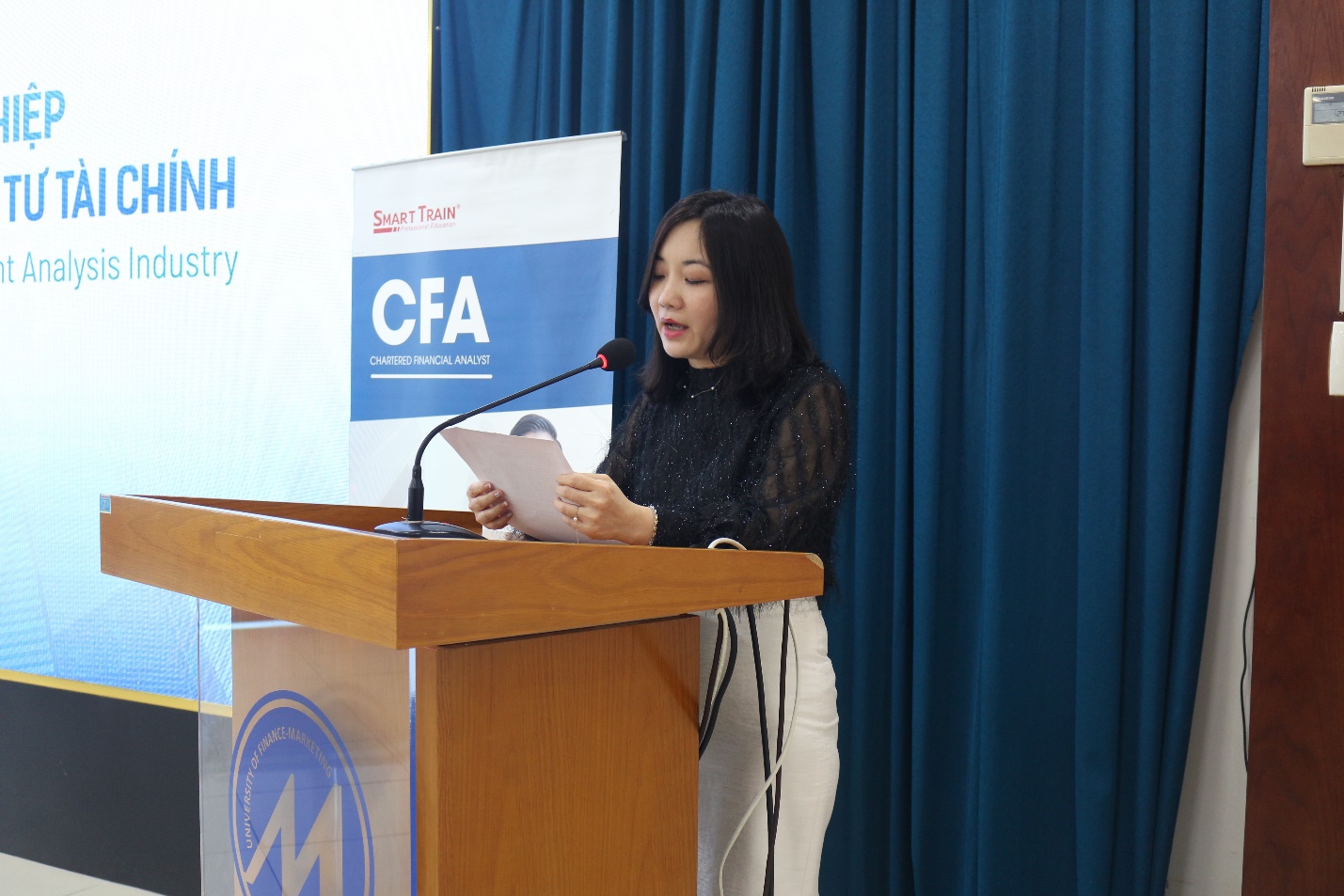 In her opening remarks, Assoc. Prof. Dr. Le Thi Thuy Hang, on behalf of UFM, expressed deep thanks to the speakers and guests for creating opportunities and an environment for students to gain a more practical perspective on Vietnam’s economy in general and the financial market in particular. This helps students form clearer orientations and deeper insights into careers in investment finance. She emphasized the vast potential of the financial analyst profession for students and the importance of defining career goals and the competencies needed to achieve them.