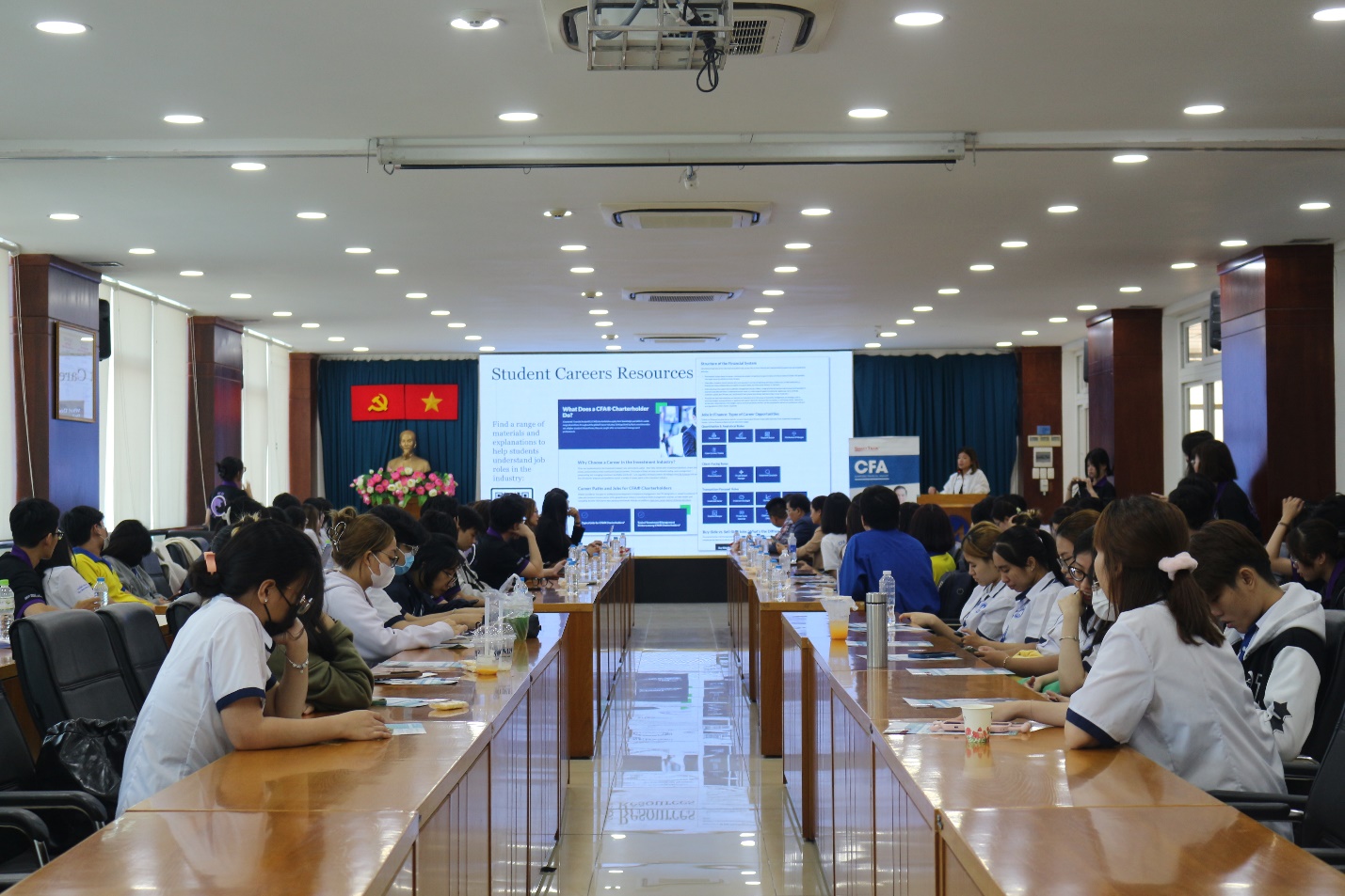 Participants from the Faculty included Assoc. Prof. Dr. Le Thi Thuy Hang, Vice Dean; MSc. Le Vo Dai Hai, Head of the Investors Club; Dr. Nguyen Tran Xuan Linh; MSc. Tran Khanh Quynh; along with lecturers and students. Speakers at the talk were Ms. Florence Wong, Director of Partner & Client Solutions, Asia–Pacific, CFA Institute (USA); and Mr. Tra Hong Nhat, Financial Analyst at Prudential Vietnam. The event drew strong participation from Finance – Banking students.