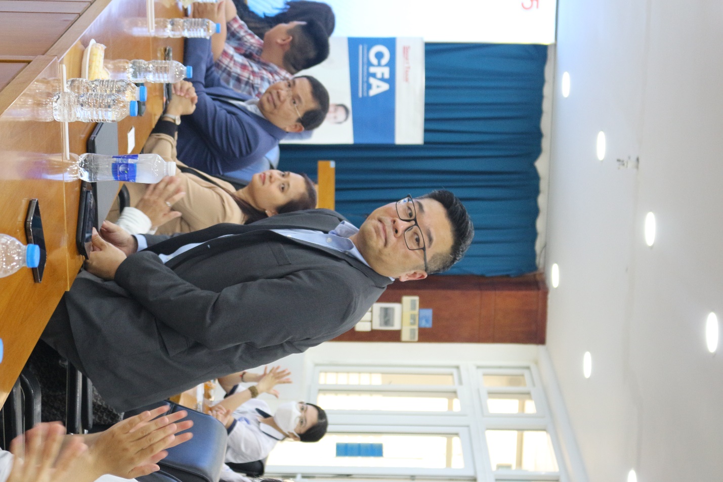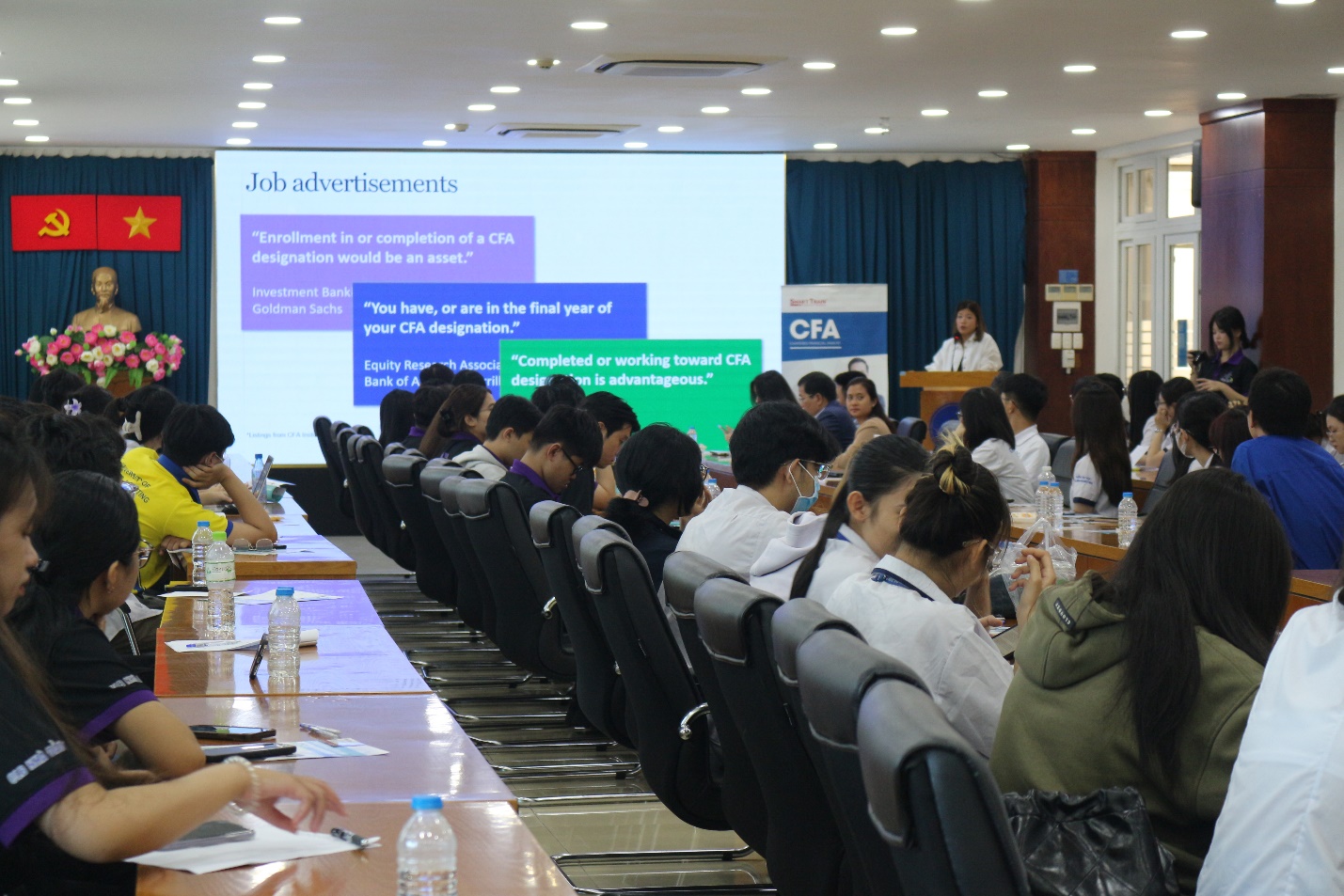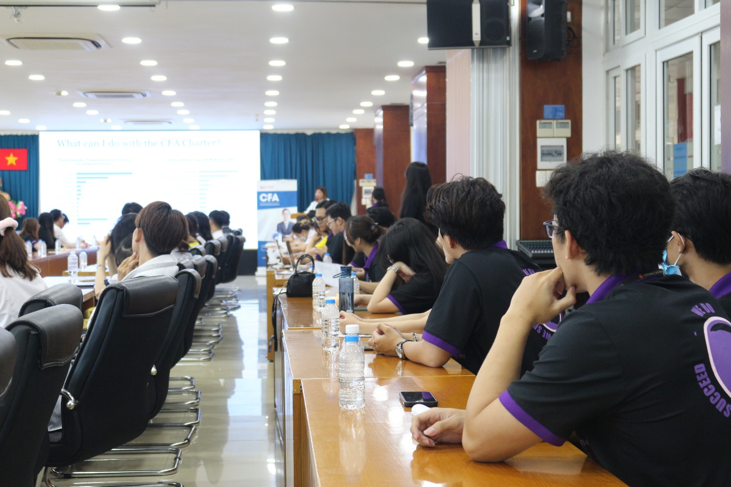 Next, Ms. Florence Wong introduced the CFA charter and the career development pathway in Investment Analysis with the CFA qualification. For students in economics and business, the CFA charter is seen as a “golden ticket” for a career path—one of the most important credentials in finance and a benchmark of competence, ethics, and skills in investment analysis.