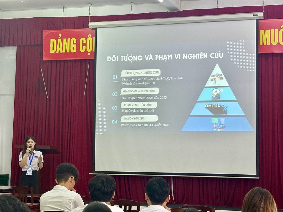 Photo 5: Topic “The relationship between digital finance, tax, and economic growth: in the context of financial development,” presented by students Nguyen Duy Minh, Le Nguyen Thanh Truc, Tran Y Thanh Truc, Hoang Anh Tuan, Nguyen Ngoc Vy Thao, supervised by Dr. Tran Thi Kim Oanh.