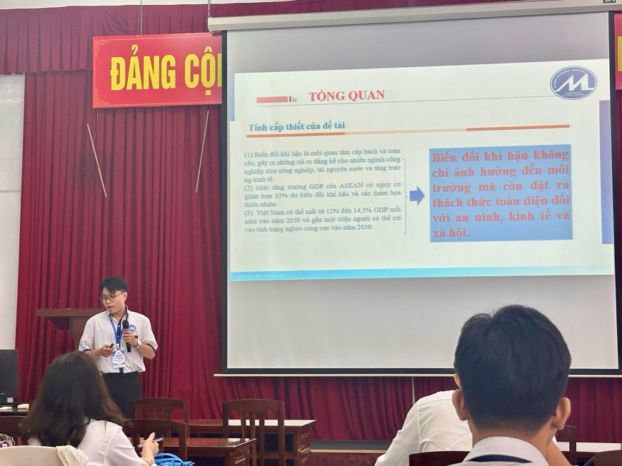 Photo 7: Topic “The impact of climate change on economic growth: a study of ASEAN countries,” by students Pham Cong Tien, Nguyen Quoc Cuong, Nguyen Thi Hang, Bui Huynh Tuyet Nhi, Phan Nguyen Thao Uyen, supervised by Assoc. Prof. Dr. Phan Thi Hang Nga.