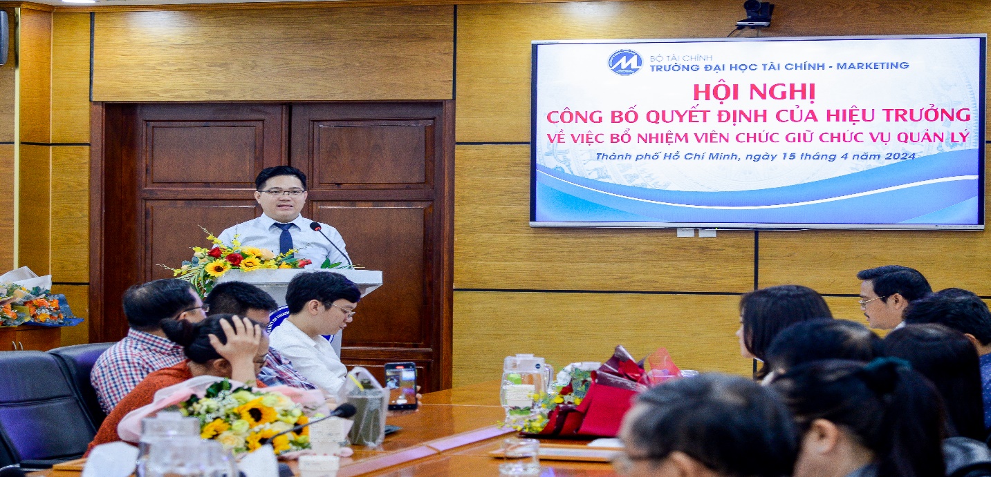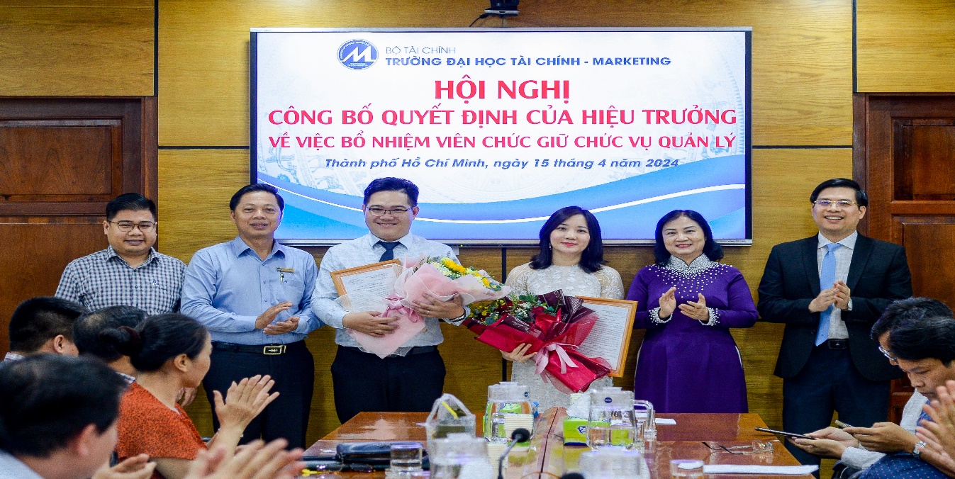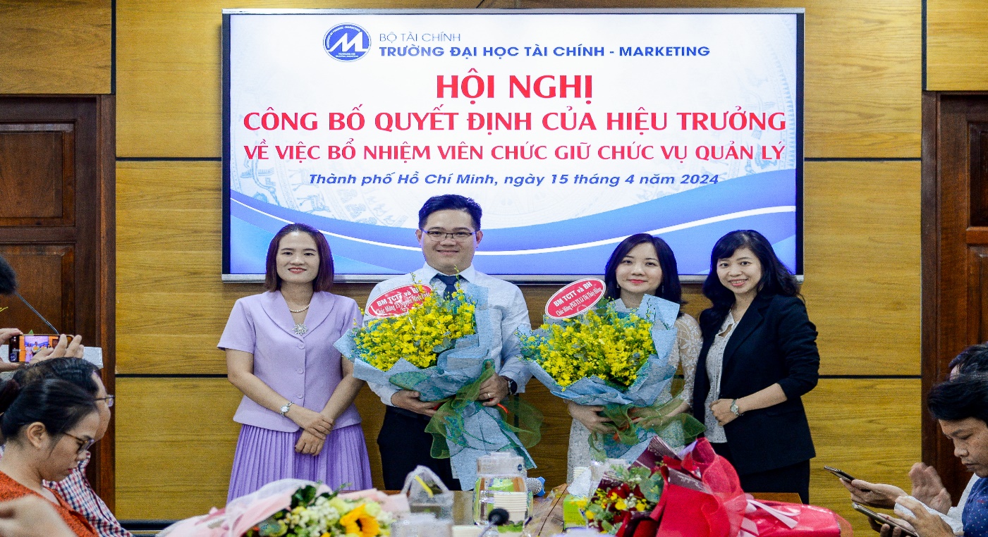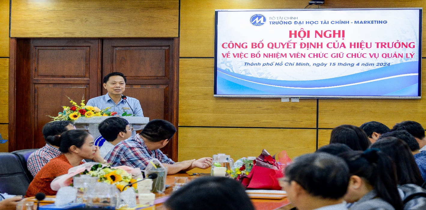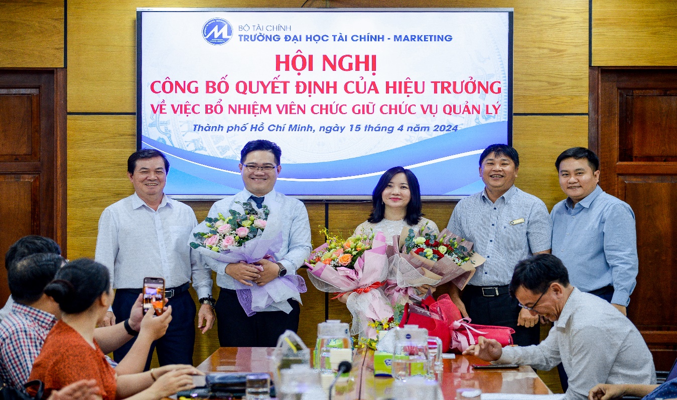 On the morning of April 15, 2024, the University of Finance – Marketing held a conference to announce the Rector’s decisions on appointing management positions for officials of the Faculty of Finance – Banking. The conference was attended by Assoc. Prof. Dr. Ho Thuy Tien, Party Committee Secretary and Chair of the University Council; Assoc. Prof. Dr. Pham Tien Dat, Rector; Dr. Le Trung Dao, Vice Rector; Dr. Cao Tan Huy, Vice Rector; Dr. Nguyen Xuan Hiep, Chair of the University Trade Union; along with leaders of units and organizations within the University, and lecturers and officials of the Faculty of Finance – Banking.