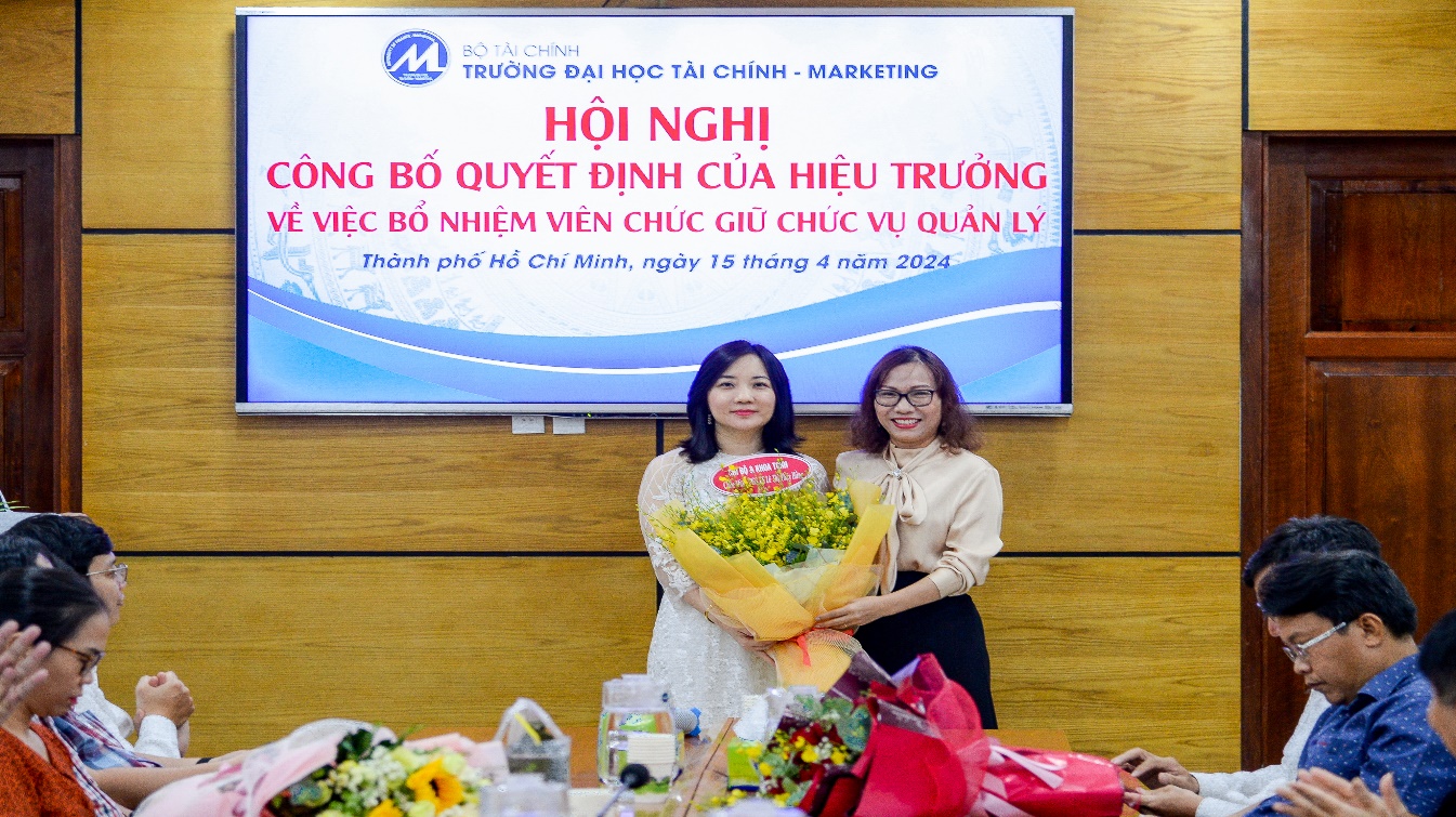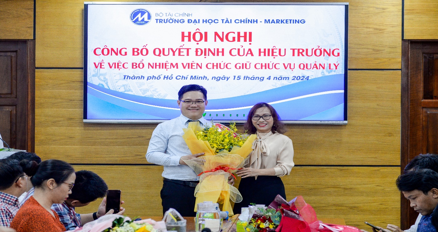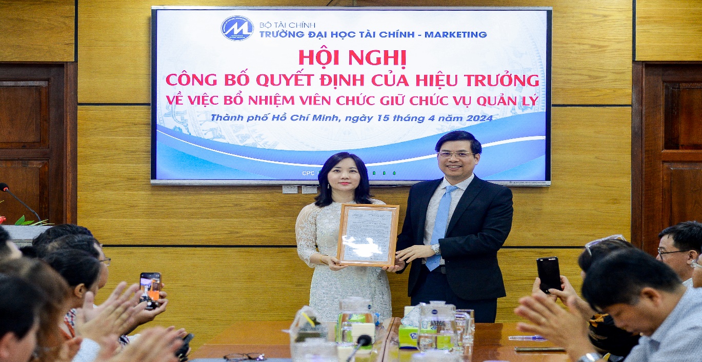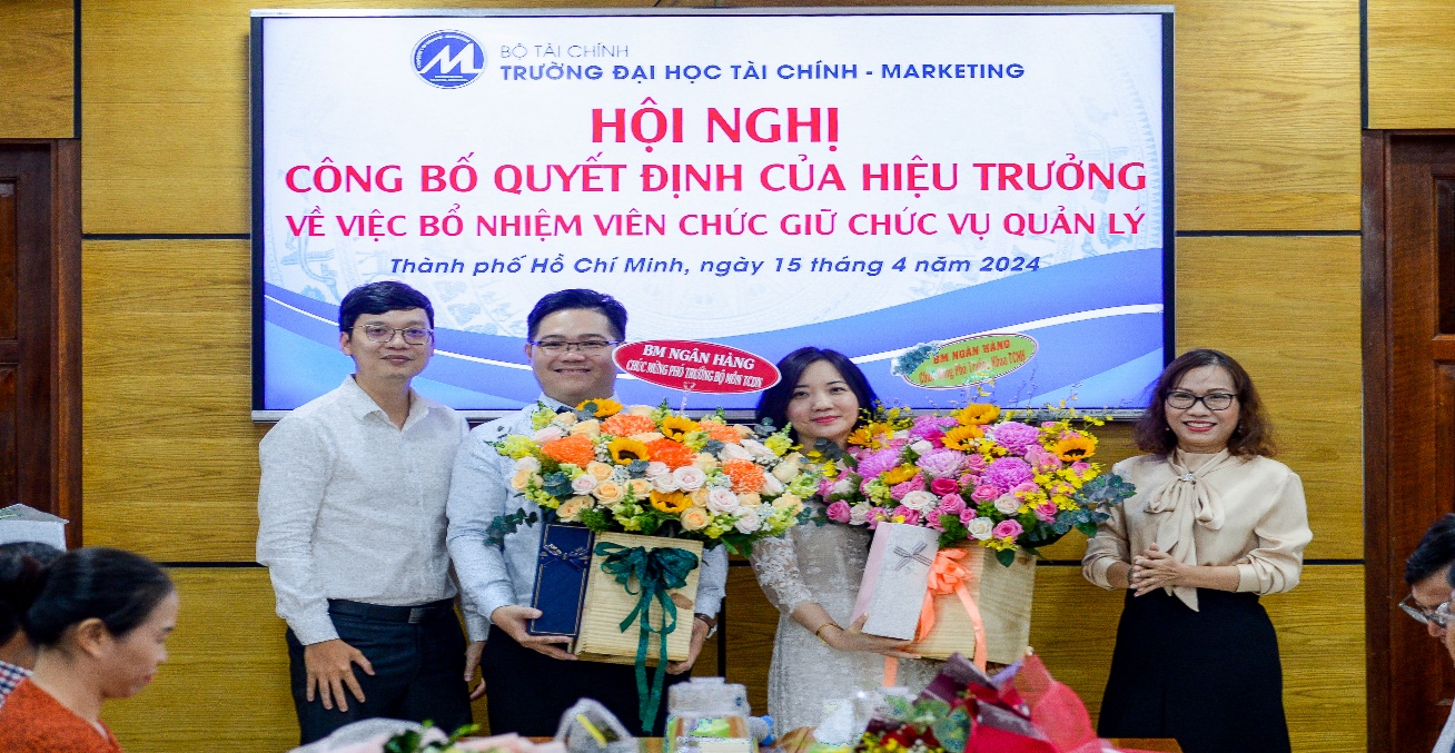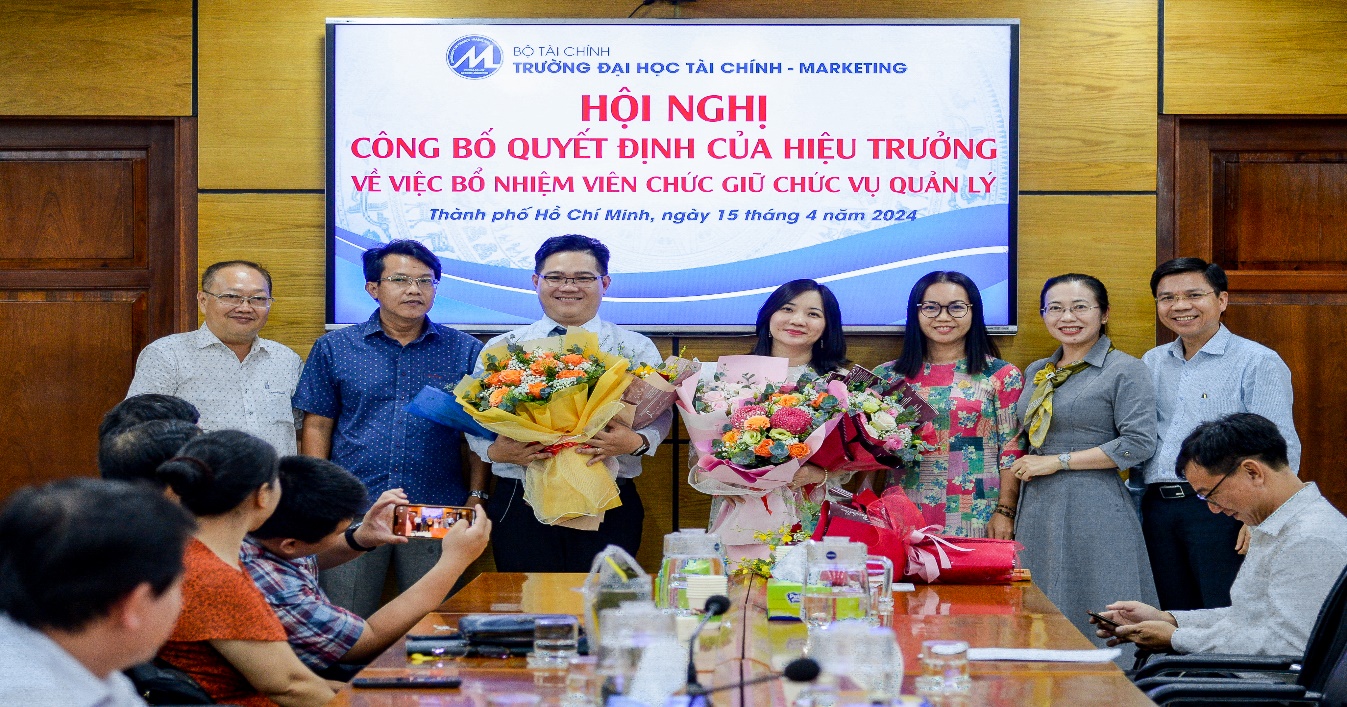 On the morning of April 15, 2024, the University of Finance – Marketing held a conference to announce the Rector’s decisions on appointing management positions for officials of the Faculty of Finance – Banking. The conference was attended by Assoc. Prof. Dr. Ho Thuy Tien, Party Committee Secretary and Chair of the University Council; Assoc. Prof. Dr. Pham Tien Dat, Rector; Dr. Le Trung Dao, Vice Rector; Dr. Cao Tan Huy, Vice Rector; Dr. Nguyen Xuan Hiep, Chair of the University Trade Union; along with leaders of units and organizations within the University, and lecturers and officials of the Faculty of Finance – Banking.