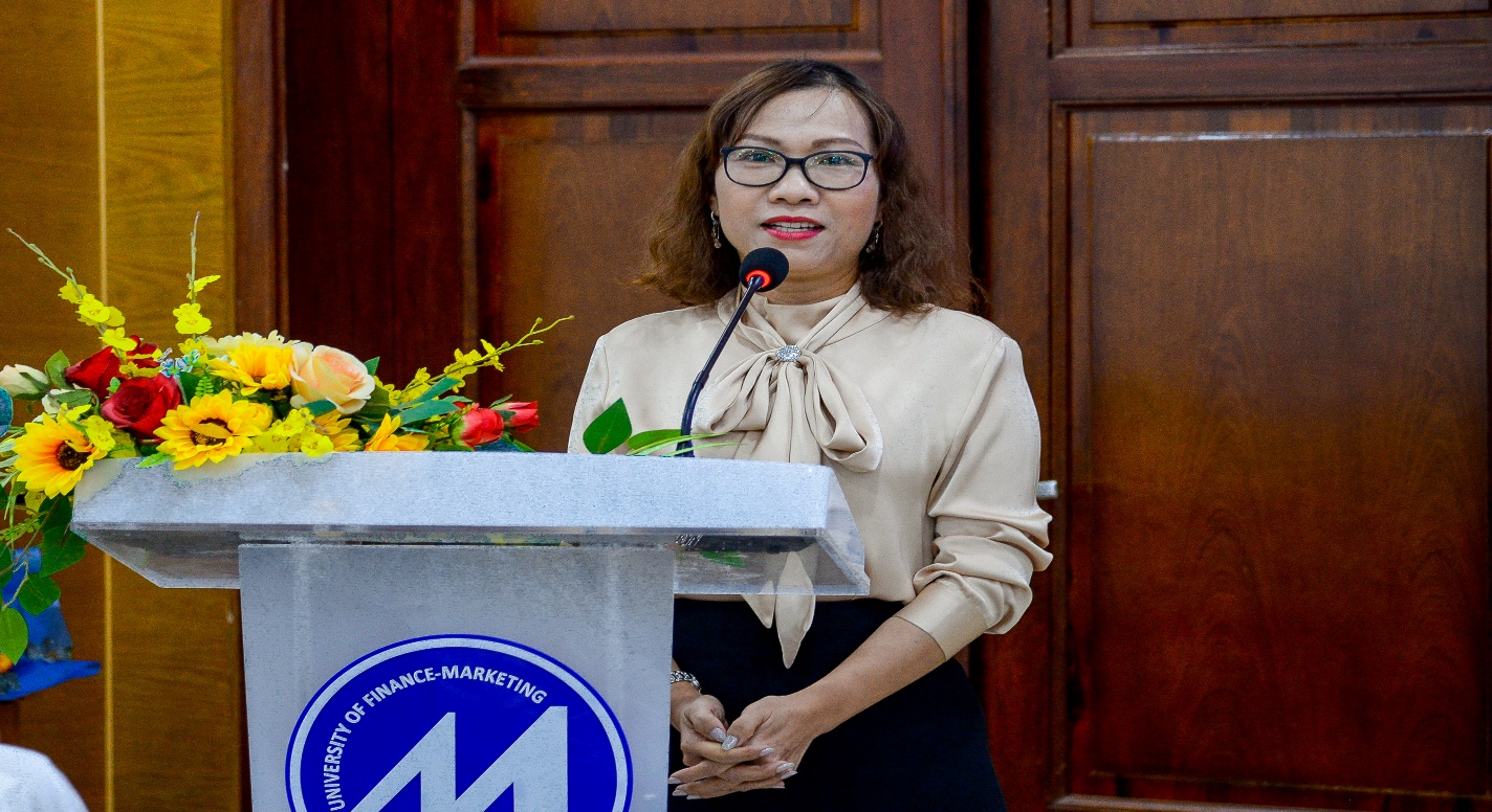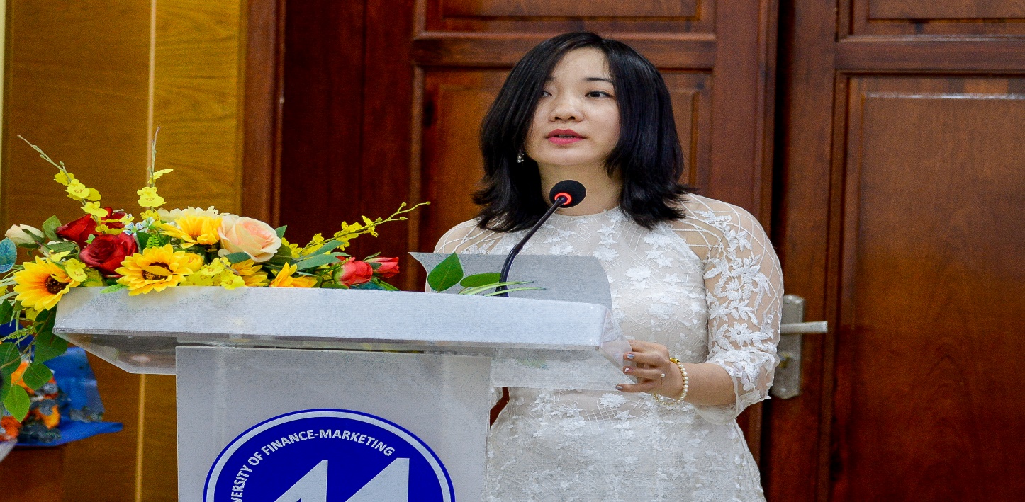 Assoc. Prof. Dr. Nguyen Thi My Linh, Dean of the Faculty of Finance – Banking, delivers her remarks at the ceremony.
